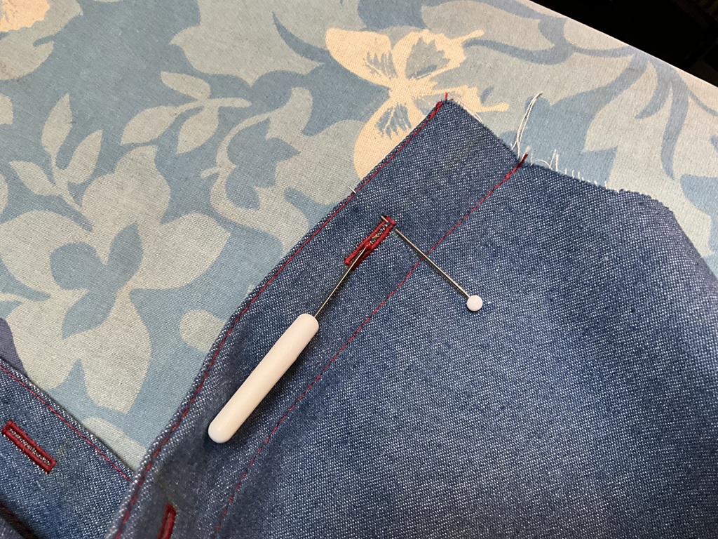 7. Jetzt rechts auf rechts den noch nicht verbundenen Rückenteil der beiden Vorderteile auf die bereits genähte Naht stecken und feststeppen.