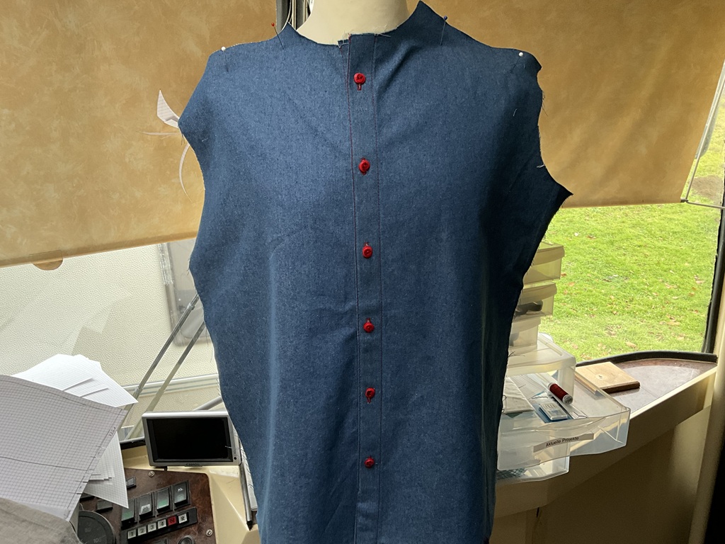 8. Alle Teile aus dem Balg hervorziehen/wenden. Alle Nähte sind jetzt in der Schulterpasse eingeschlossen. Die beiden vorderen Passennähte ebenfalls mit Ziergarn absteppen.